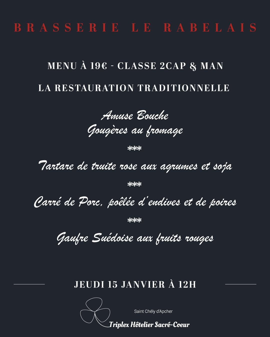 Nous vous rappelons que les menus proposés sont uniques et qu'il ne nous est pas possible de vous proposer de plats alternatifs.