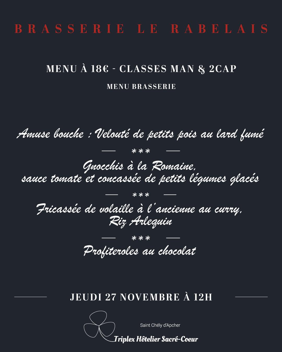 Nous vous rappelons que les menus proposés sont uniques et qu'il ne nous est pas possible de vous proposer de plats alternatifs.