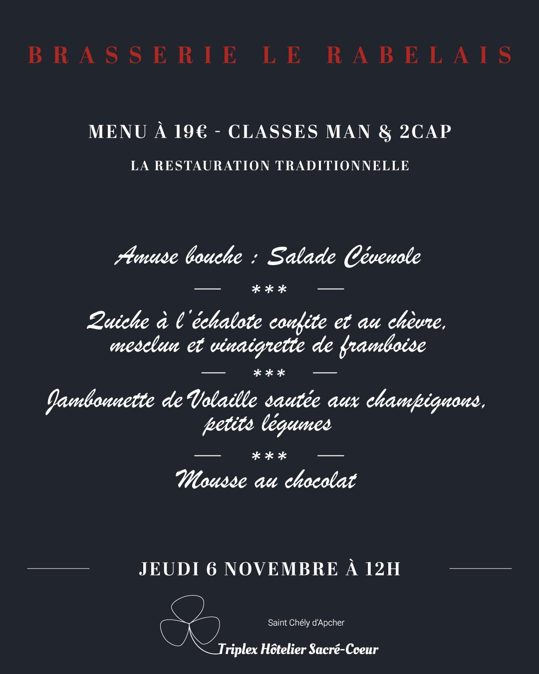 Nous vous rappelons que les menus proposés sont uniques et qu'il ne nous est pas possible de vous proposer de plats alternatifs.