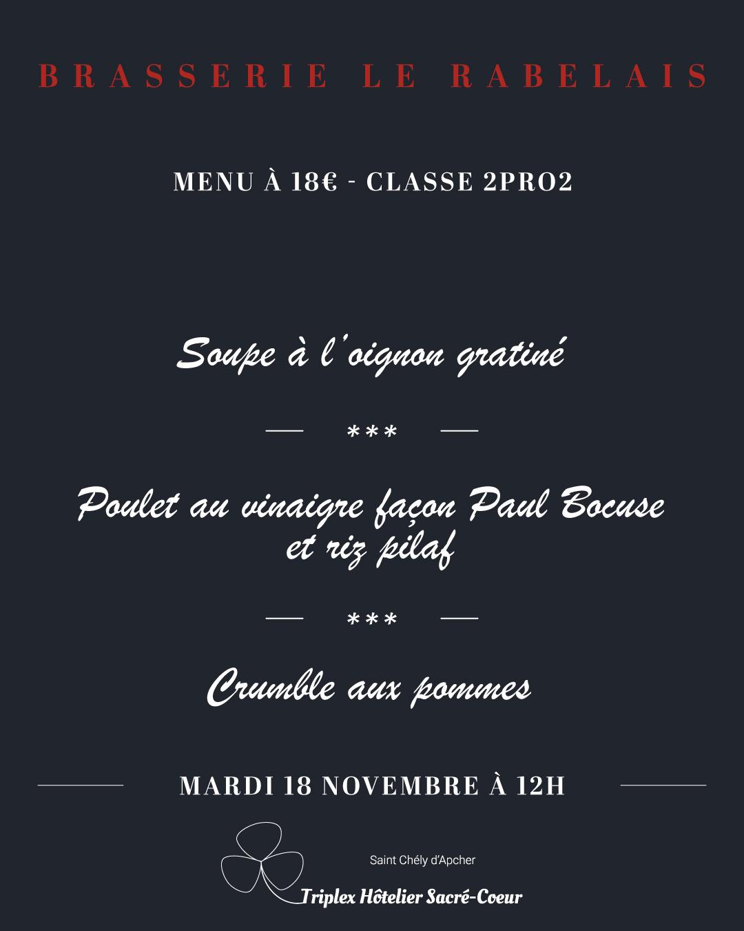 Nous vous rappelons que les menus proposés sont uniques et qu'il ne nous est pas possible de vous proposer de plats alternatifs.