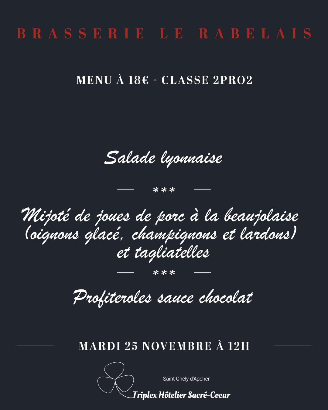 Nous vous rappelons que les menus proposés sont uniques et qu'il ne nous est pas possible de vous proposer de plats alternatifs.