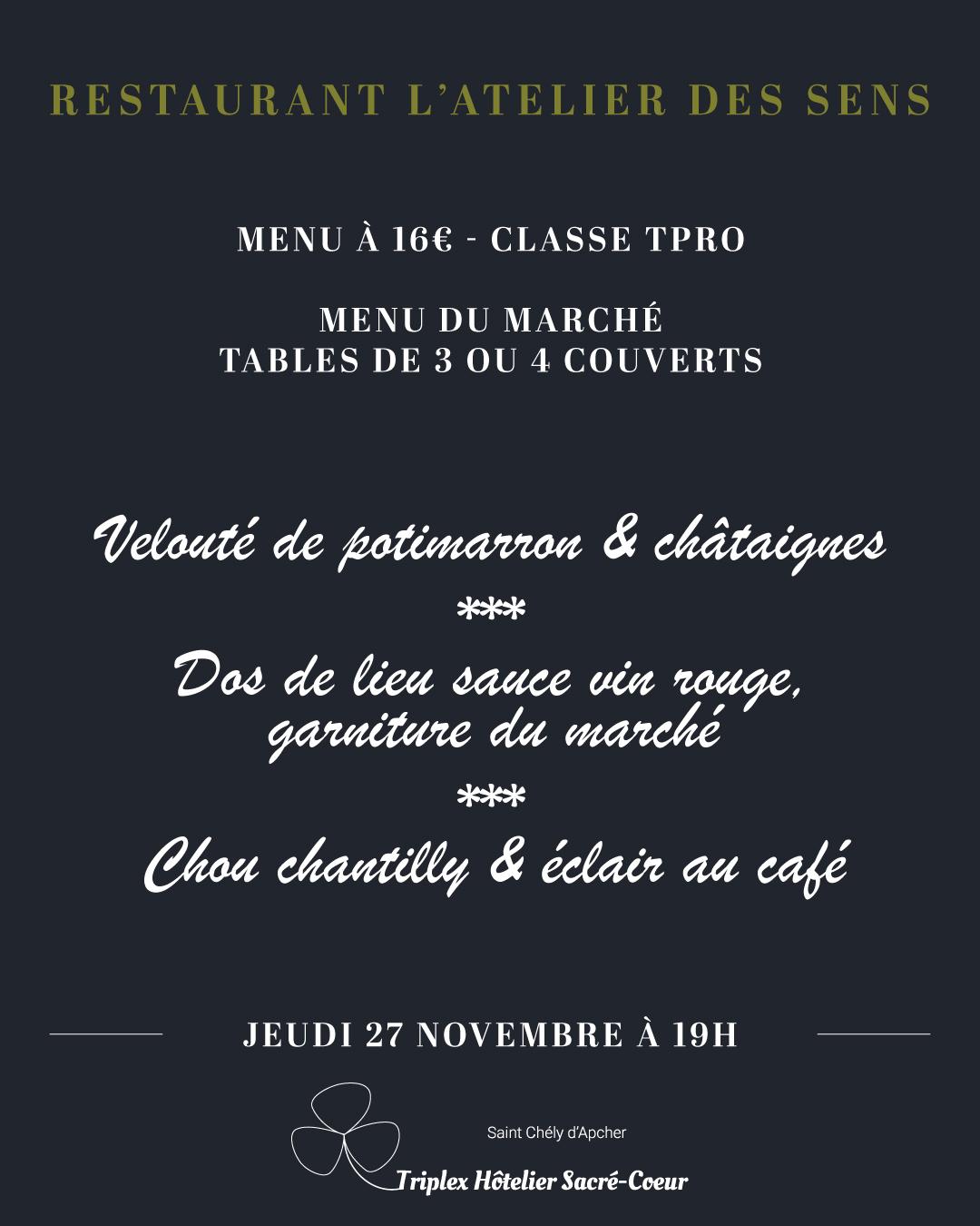 Nous vous rappelons que les menus proposés sont uniques et qu'il ne nous est pas possible de vous proposer de plats alternatifs.