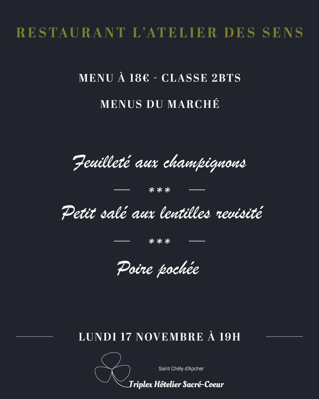 Nous vous rappelons que les menus proposés sont uniques et qu'il ne nous est pas possible de vous proposer de plats alternatifs.