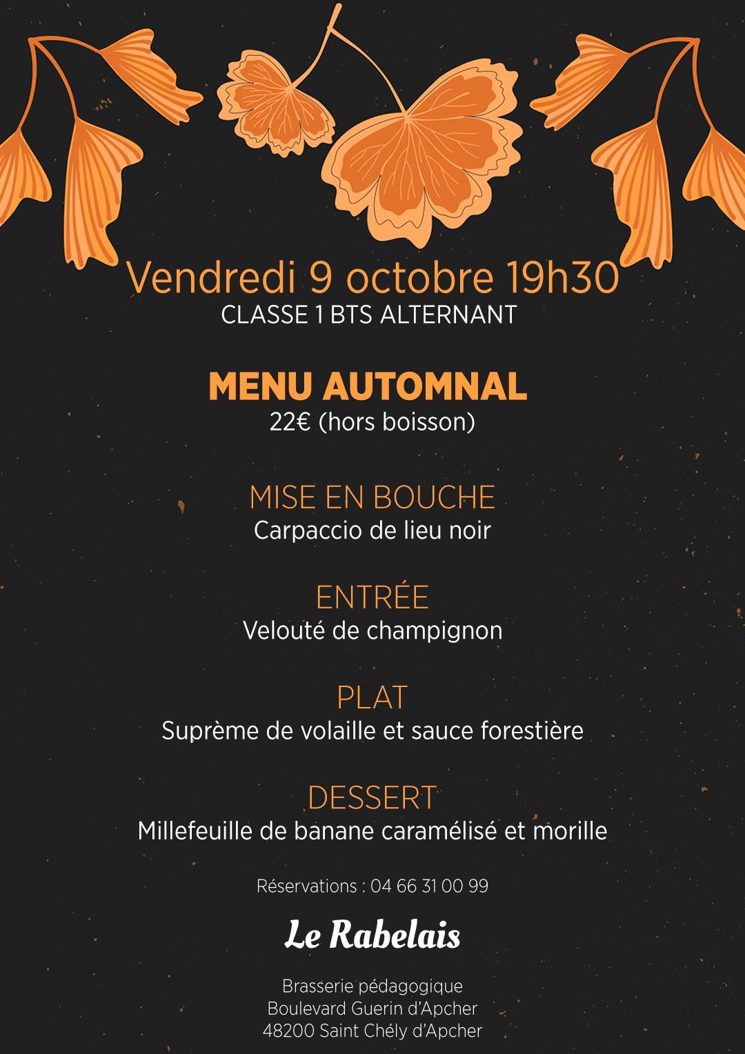 MENU AUTOMNAL 22€ (hors boisson) : MISE EN BOUCHE Carpaccio de lieu noir | Entrée Velouté de champignon | Plat Suprème de volaille et sauce forestière | Dessert Millefeuille de banane caramélisé et morille